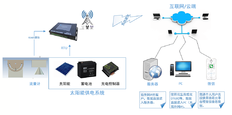 系統(tǒng)由雷達(dá)流速儀、超聲波液位儀、RTU、數(shù)據(jù)采集中集器、太陽(yáng)能供電系統(tǒng)、流量模塊、管理軟件、移動(dòng)數(shù)據(jù)卡、計(jì)算機(jī)等組成。